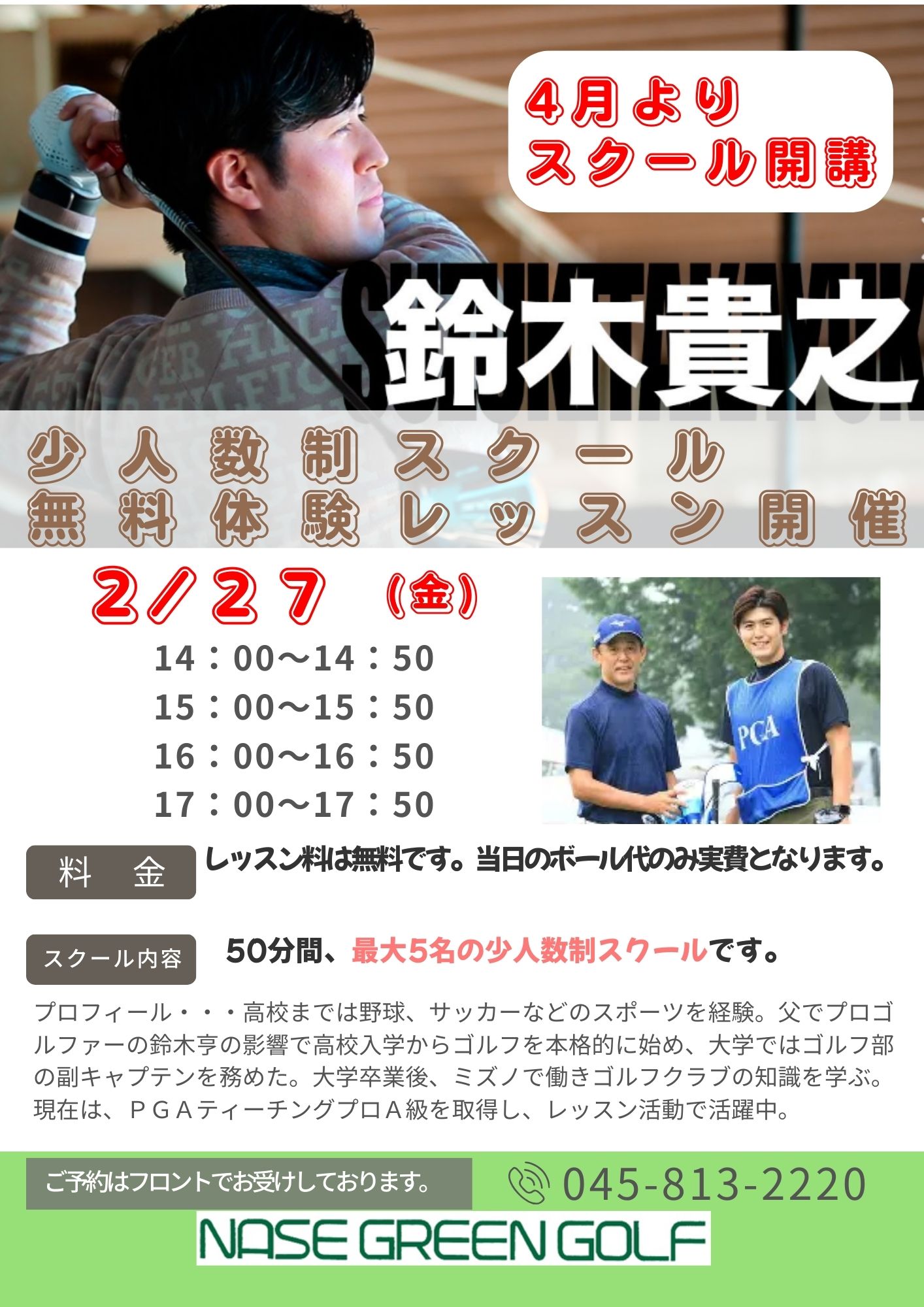 4月から少人数制ゴルフスクールに新しく鈴木貴之プロが加わります。それに先駆け2月27日(金)の14:00~17:50の間、無料体験レッスン会を開催いたします。お時間がございましたら、ぜひご参加ください。なお、ボール代につきましては実費とさせていただきます。