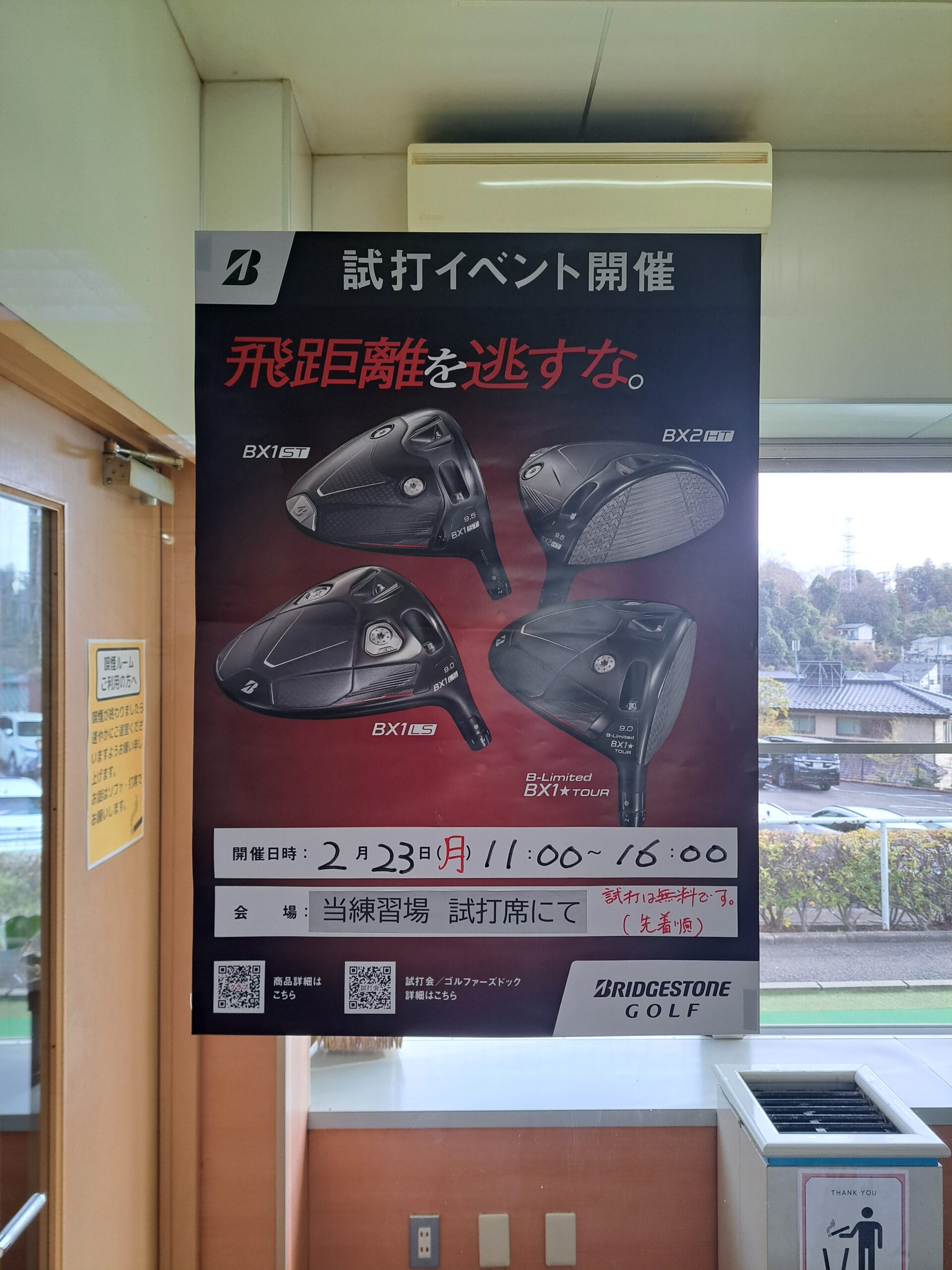 ニュース 2月 23日(月・祝)『ブリヂストン』試打会のお知らせ 2月23日(月・祝)に『ブリヂストン』の試打会を開催いたします。参加無料となっておりますので、是非お越しいただき『新商品』をお試しください。 ※当練習場2階 開催時間11:00~16:00