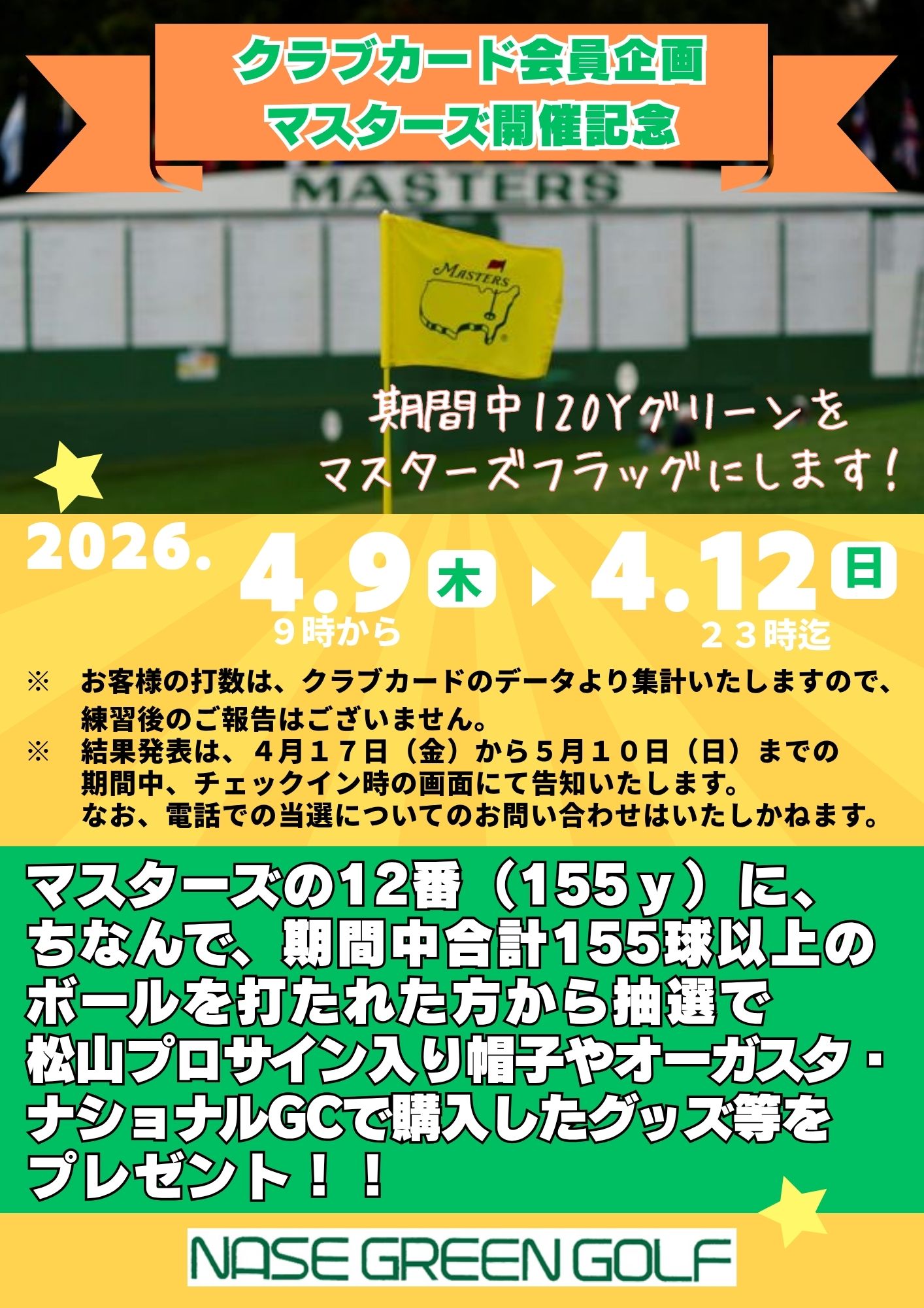 いつもナセグリーンゴルフをご愛顧いただき誠にありがとうございます。マスターズ開催を記念して4月9日(木)から4月12日(日)までイベントを開催いたします。期間中、合計155球以上打たれた方を対象に抽選で松山プロサイン入り帽子やオーガスタ・ナショナルGCで購入したグッズ等をプレゼントいたします。是非ご来場ください。